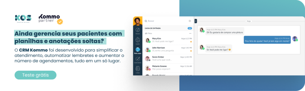 Com o Kommo, todo o histórico de relacionamento do paciente fica centralizado. É possível saber quando foi o último contato, qual procedimento foi realizado, se houve faltas, quais mensagens já foram trocadas e em que etapa do funil de atendimento o paciente está. Isso evita que o paciente tenha que repetir informações e transmite uma sensação clara de organização e profissionalismo.