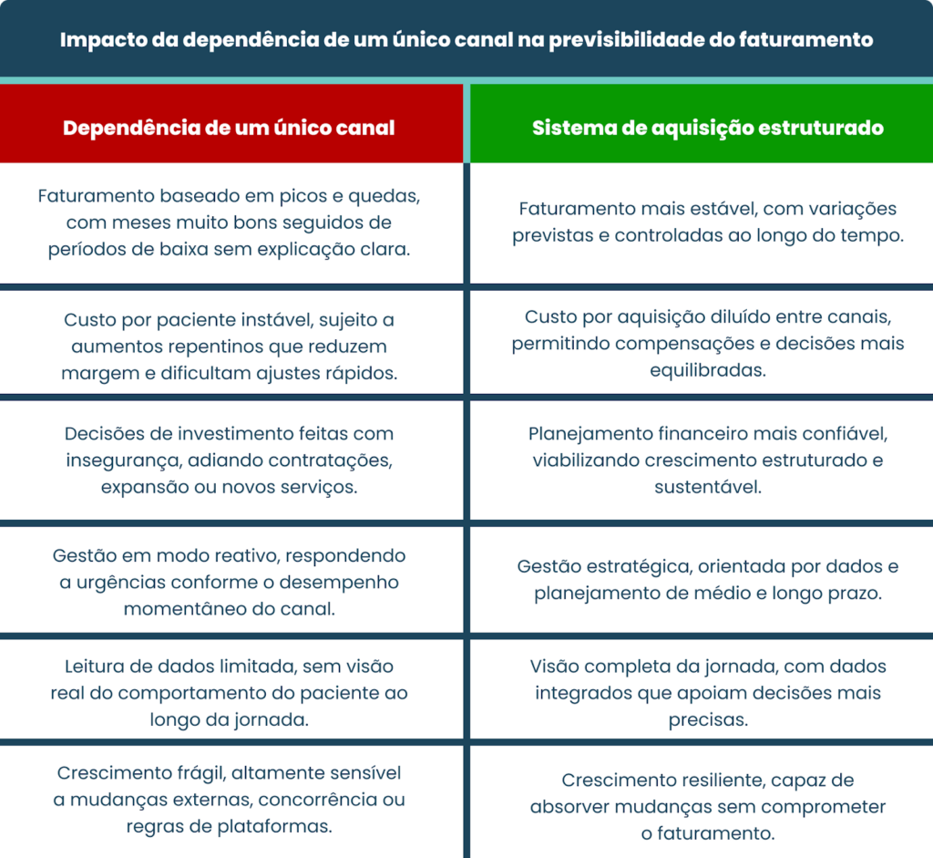A previsibilidade do faturamento está diretamente ligada à capacidade da clínica de controlar e entender sua aquisição. Quando toda a entrada de pacientes depende de um único canal, essa previsibilidade se perde. O faturamento passa a oscilar conforme fatores externos, e não conforme planejamento estratégico.
